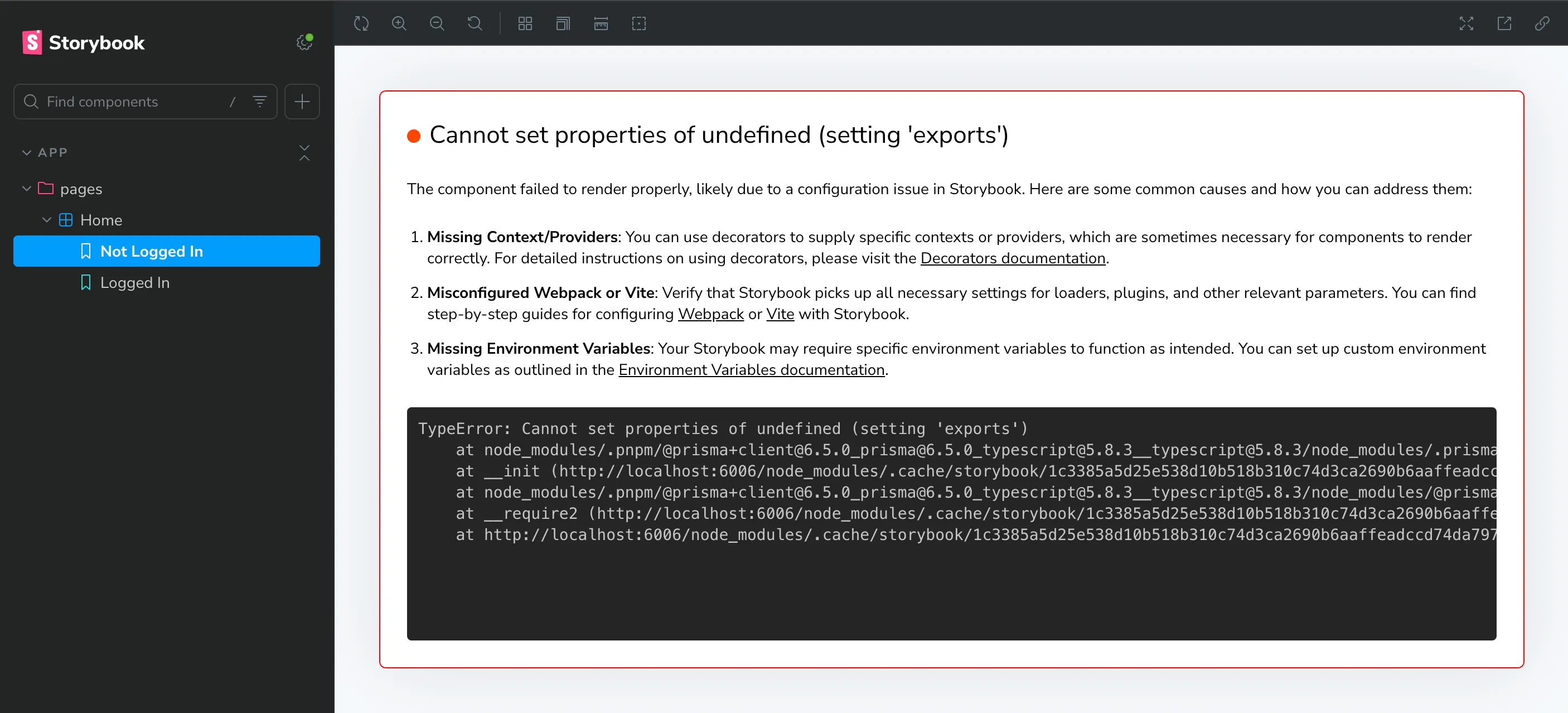 Now, if we go to our Storybook site, we’ll see that it throws an intimidating error. Take a closer look, and we’ll see that it’s coming from the Prisma client: