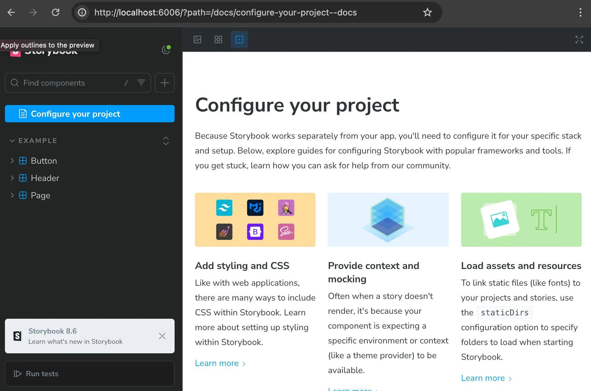 Storybook will finish installing, and then start our Storybook server: